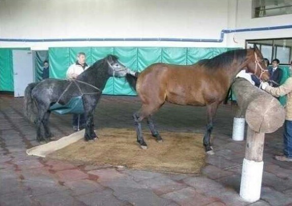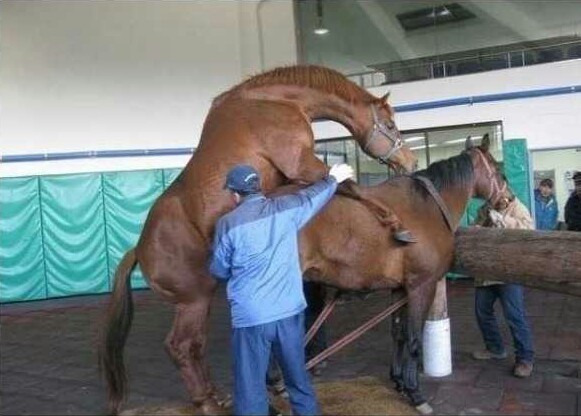 암말의 힘이 다 빠질때까지 시정마는 암말의 뒷발질을 맞아가며 다가서고 암말이 힘이 빠져 얌전해지면 그제서야 시정마를 강제로 퇴장시키고 종마를 들여 교미를 성사시킵니다.