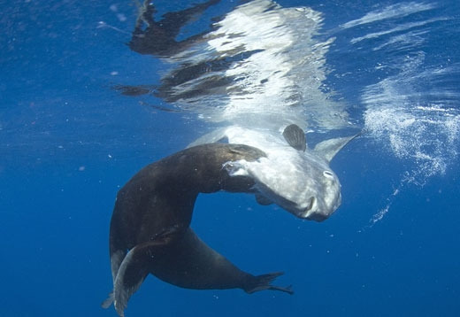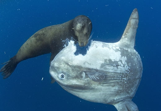 사진 속 주인공은 미 서부해안에 서식하는 바다사자와 개복치다. '바다의 포식자' 중 하나인 바다사자가 순식간에 개복치의 몸통을 뜯어먹는 이 장면은 잔인하지만 한편으로는 경외감마저 주는 것이 사실.