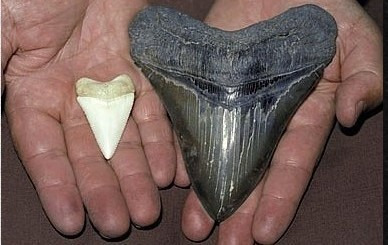 왼쪽은 백상어의 이빨, 오른쪽은 메갈로돈의 이빨