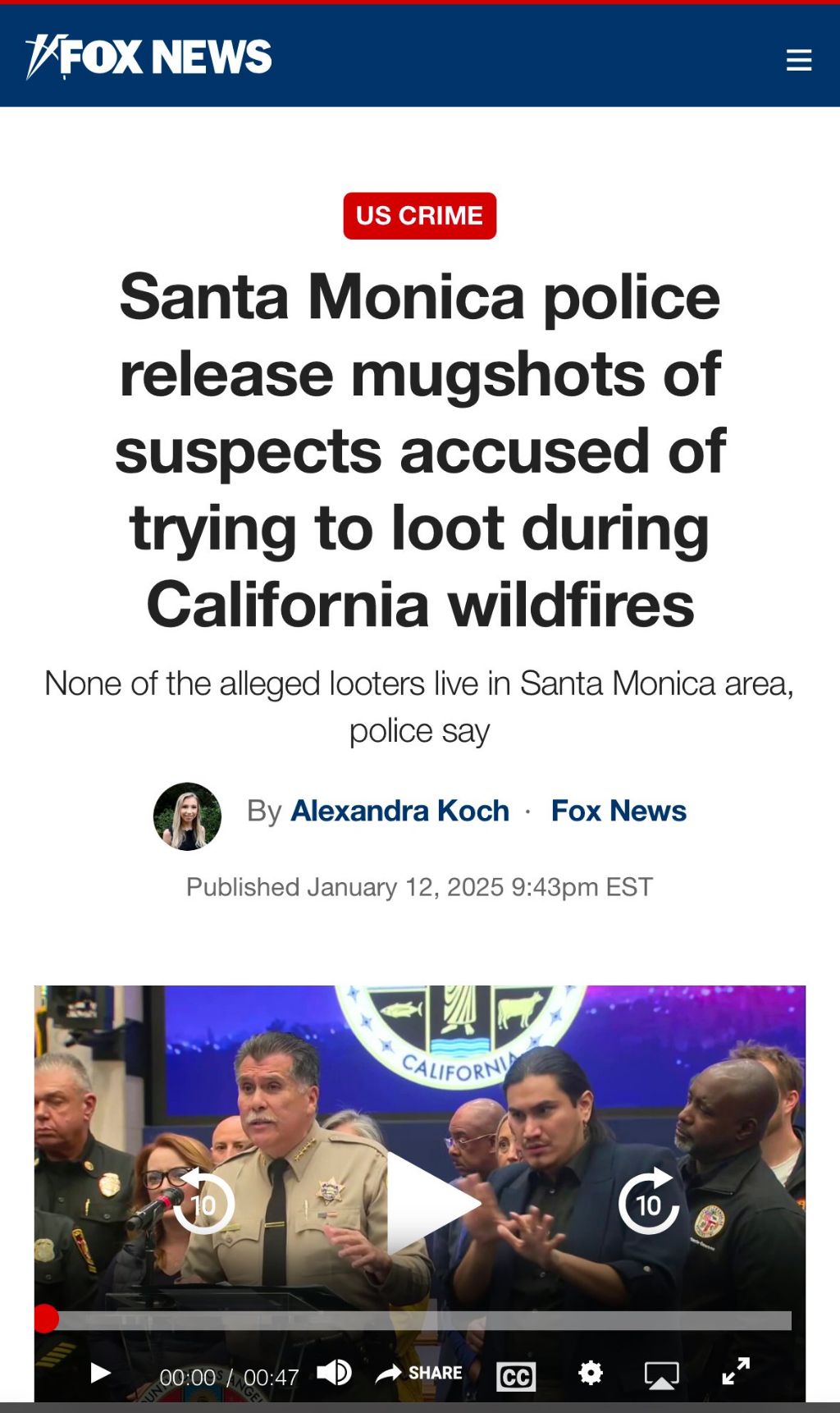 산타모니카 경찰국(SMPD)은 최근 약 12명에 달하는 절도 미수 용의자의 신원을 공개했습니다. 팰리세이즈 파이어 경찰은 약탈자들은 시외 구역에서 온 것으로 보여지며 산타모니카의 대피 구역에 아무도 거주하지 않는다고 밝혔다.