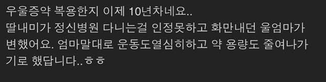 우울증 걸린 딸을 위로해주는 어머니의 카톡 작성자키보드워리어|작성시간25.03.18|조회수161 목록 댓글 0 글자크기 작게가 글자크기 크게가 다음검색 현재 게시글 추가 기능 열기 북마크 공유하기 신고 센터로 신고 댓글 댓글 0 댓글쓰기 답글쓰기 댓글 리스트
