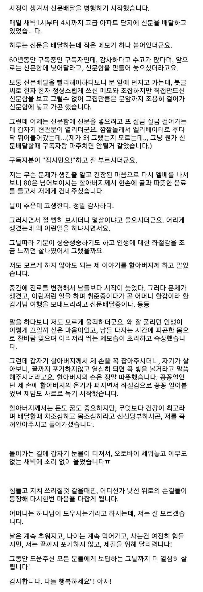 신문 배달하다가 오열한 배달부 작성자키보드워리어|작성시간25.03.18|조회수9,107 목록 댓글 0 글자크기 작게가 글자크기 크게가 다음검색 현재 게시글 추가 기능 열기 북마크 공유하기 신고 센터로 신고 댓글 댓글 0 댓글쓰기 답글쓰기 댓글 리스트