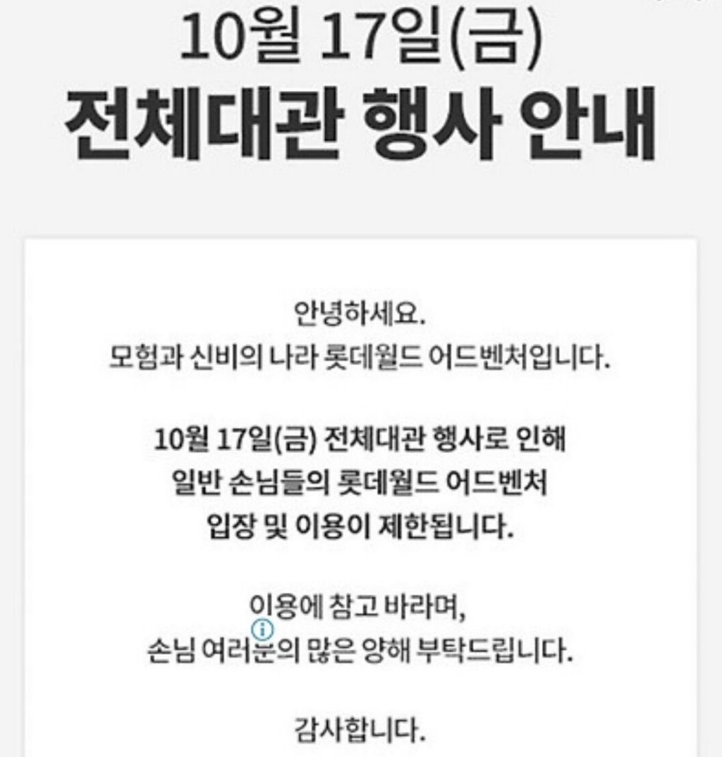 10월17일 하루 롯데월드 이용 불가 작성자키보드워리어|작성시간25.09.29|조회수150 목록 댓글 0 글자크기 작게가 글자크기 크게가 롯데그룹 임직원 가족 행사로 롯데 월드 전체 대관 다음검색 현재 게시글 추가 기능 열기 북마크 공유하기 신고 센터로 신고 댓글 댓글 0 댓글쓰기 답글쓰기 댓글 리스트