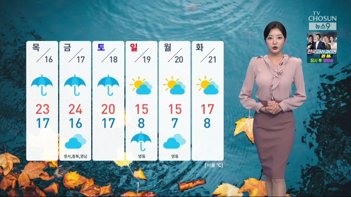 목요일까지 전국 가을비…다음주 기온 뚝 떨어져 작성자키보드워리어|작성시간25.10.15|조회수51 목록 댓글 0 글자크기 작게가 글자크기 크게가 다음검색 현재 게시글 추가 기능 열기 북마크 공유하기 신고 센터로 신고 댓글 댓글 0 댓글쓰기 답글쓰기 댓글 리스트