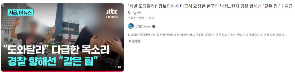 캄보디아 도로 한복판에서 구조요청하는 한국인 "김민혁" 작성자키보드워리어|작성시간25.10.25|조회수1,024 목록 댓글 1 글자크기 작게가 글자크기 크게가 뉴스에 방송되고 외교부에서 확인중에 있다고 한다. 다음검색 현재 게시글 추가 기능 열기 북마크 공유하기 신고 센터로 신고 댓글 댓글 1 댓글쓰기 답글쓰기 댓글 리스트 작성자Blueday1 | 작성시간 25.10.27 대한민국 대사관으로 연결해달라는데... 자꾸 한통속인 캄보디아경찰을 부른다고 하니... 깝깝했을 듯... 댓글 전체보기