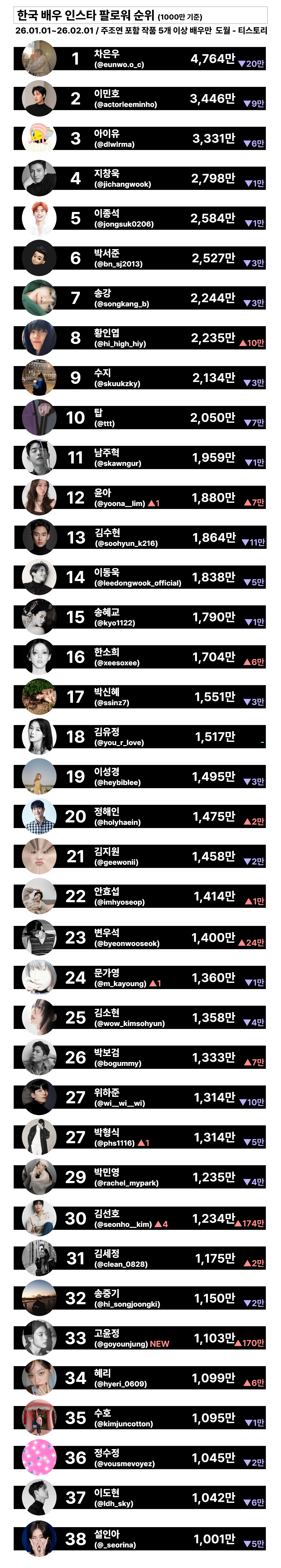 2026년 2월 한국 배우 인스타 팔로워 순위 (1000만 기준) 작성자키보드워리어.|작성시간26.02.06|조회수150 목록 댓글 0 글자크기 작게가 글자크기 크게가 다음검색 현재 게시글 추가 기능 열기 북마크 공유하기 신고 센터로 신고 댓글 댓글 0 댓글쓰기 답글쓰기 댓글 리스트