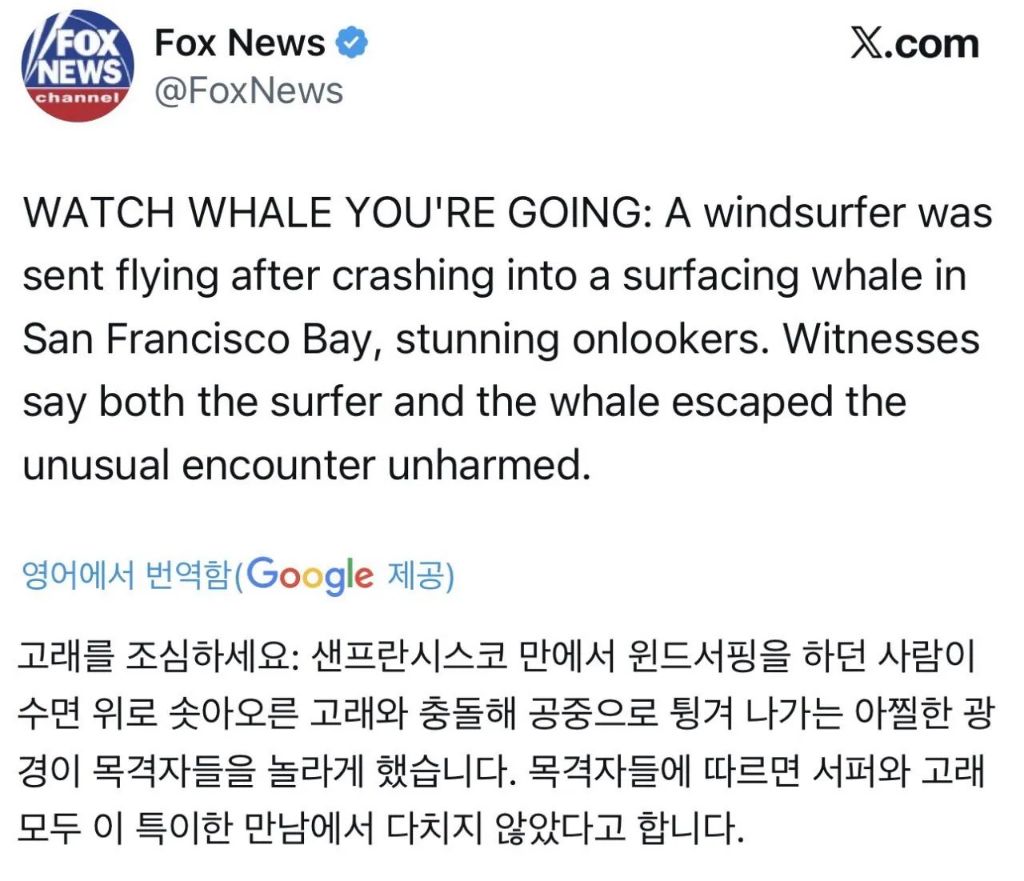 샌프란시스코, 윈드서핑중 솟아오른 고래와 부딪힌 서퍼 작성자키보드워리어.|작성시간26.04.01|조회수46 목록 댓글 0 글자크기 작게가 글자크기 크게가 다음검색 현재 게시글 추가 기능 열기 북마크 공유하기 신고 센터로 신고 댓글 댓글 0 댓글쓰기 답글쓰기 댓글 리스트