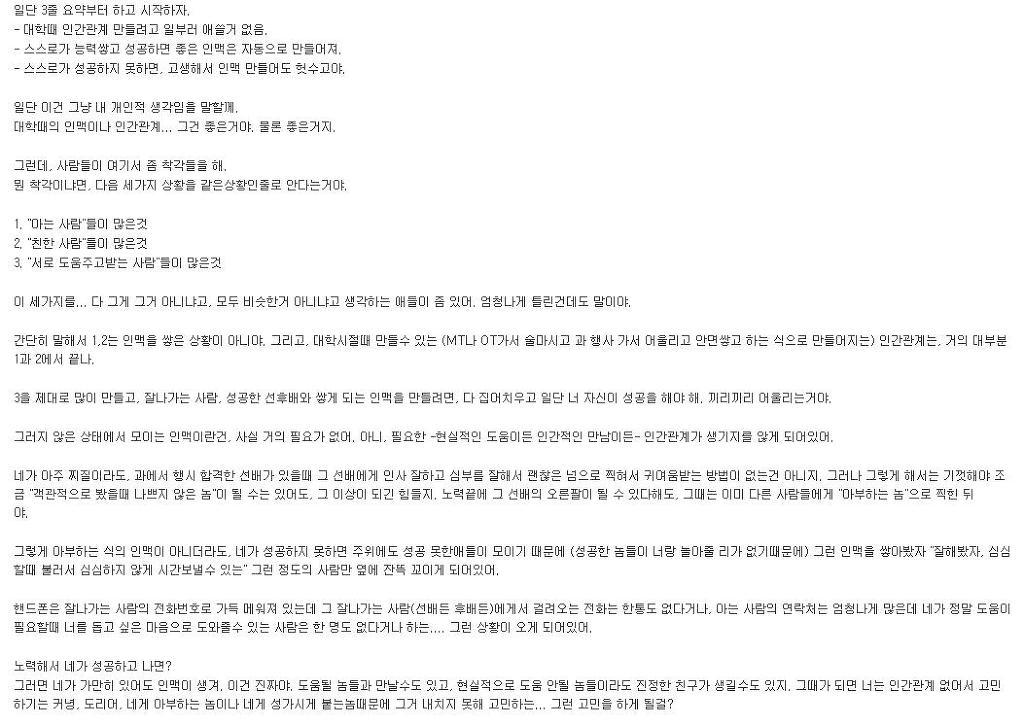 작성자식혜 작성시간 10.11.10 맞는말이죠.슬프지만 맞는말ㅋㅋㅋ물론 예외도 있겠지만...대부분 맞죠 저런게ㅋㅋ근데 저런글 보고 인간관계에 너무 편견은 안갖길 바란다는...ㅋㅋㅋ