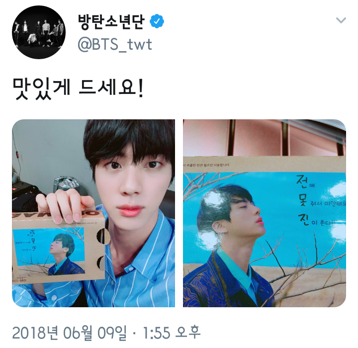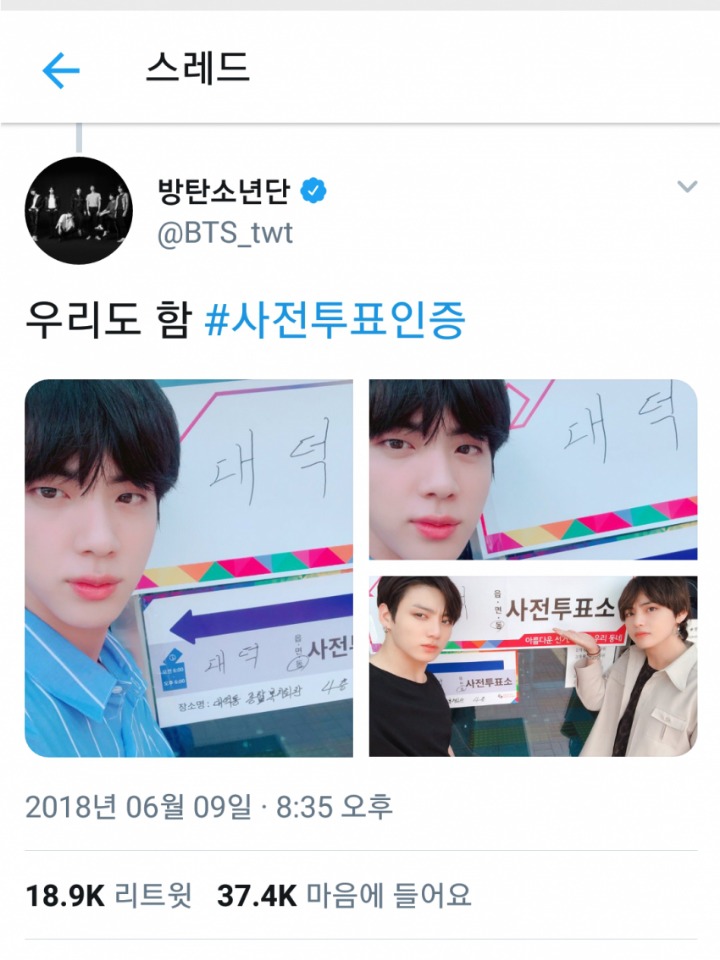 6/9 방탄소년단 트위터 작성자루미너스|작성시간18.06.09|조회수1,371 목록 댓글 4 글자크기 작게가 글자크기 크게가 곧 음악방송인데, 사전투표했군요.*******석진이는 오늘 음악방송 방청 온 아미들에게 치킨을..*******방탄이들 다 투표갔군요^^윤기 인증ㅎ지민이^^ 다음검색 현재 게시글 추가 기능 열기 북마크 공유하기 신고 센터로 신고 댓글 댓글 4 댓글쓰기 답글쓰기 댓글 리스트 작성자누리네 | 작성시간 18.06.09 ㅋㅋㅋ전.못.진/ 나두받구싶어라~^^ 작성자루미너스 작성자 본인 여부 작성자 | 작성시간 18.06.09 음악방송 가기전에 단체로 사전투표갔었네요. 트위터 추가했어요♡ 작성자신한류 | 작성시간 18.06.09 아이쿠 참 잘했어요~^^ 오랜만에 궁디 퐝퐝퐝ㅋㅋ 작성자히페리온 | 작성시간 18.06.10 역시 내가 사랑한 개념돌~ 댓글 전체보기