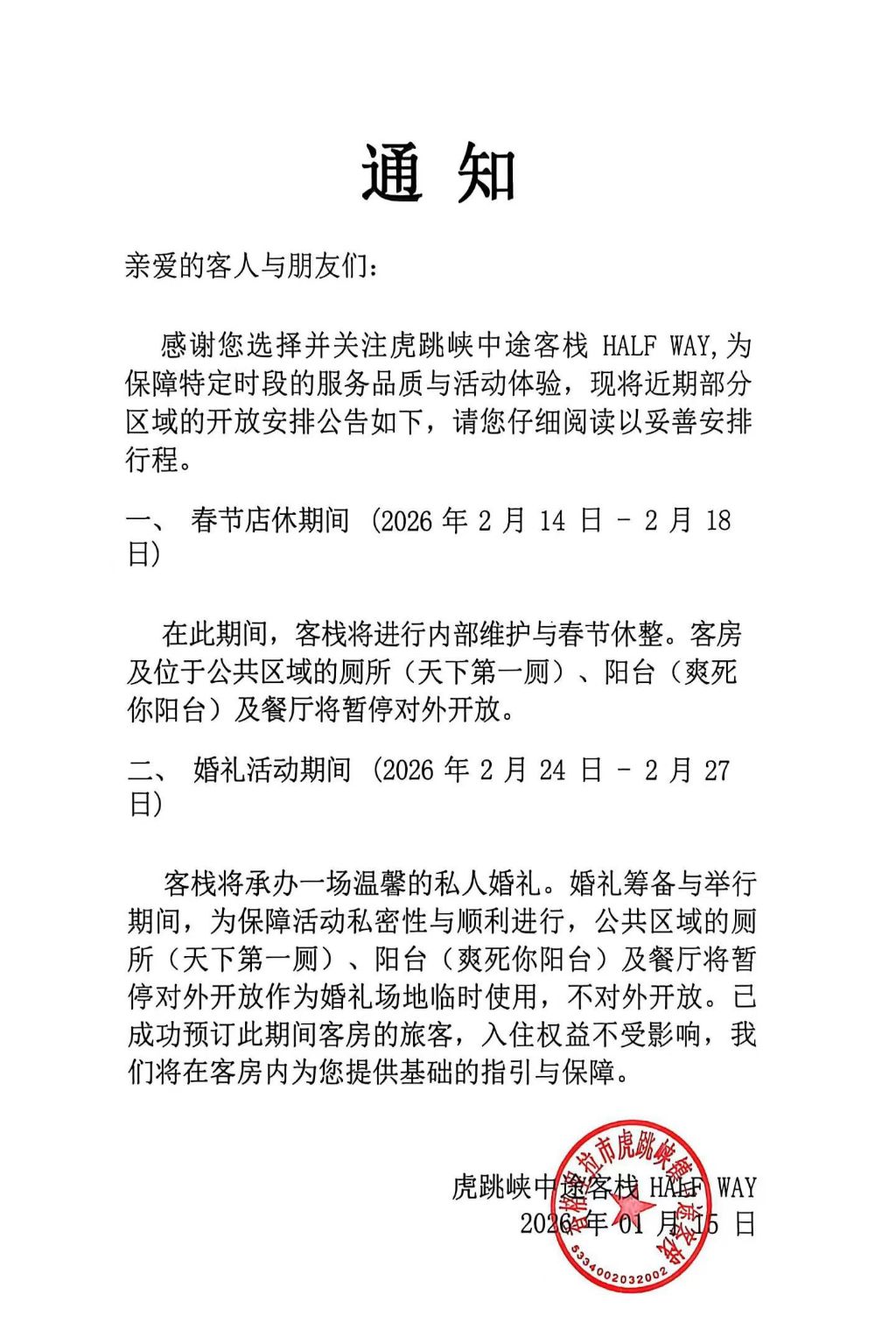 1. 客栈将不对外开放,谢绝参观与拍照。