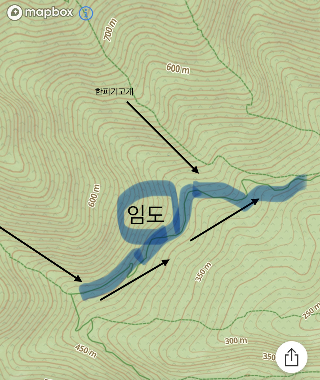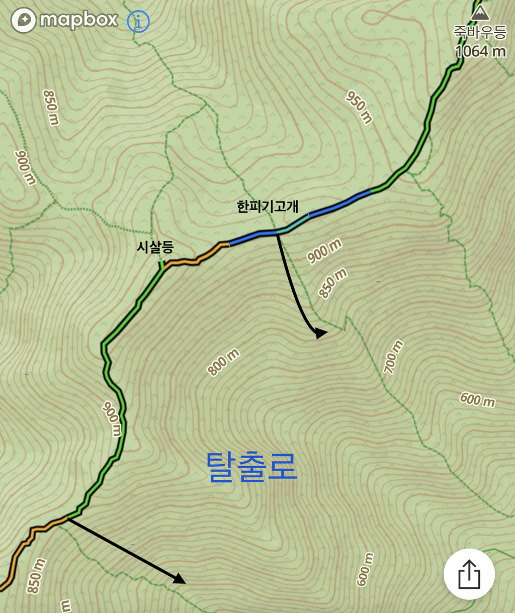 죽바우등을 지나 한피기고개에서 내려가는 길과 시살등 지나서 내려가는 길(여긴 이름이 한파기 고개)