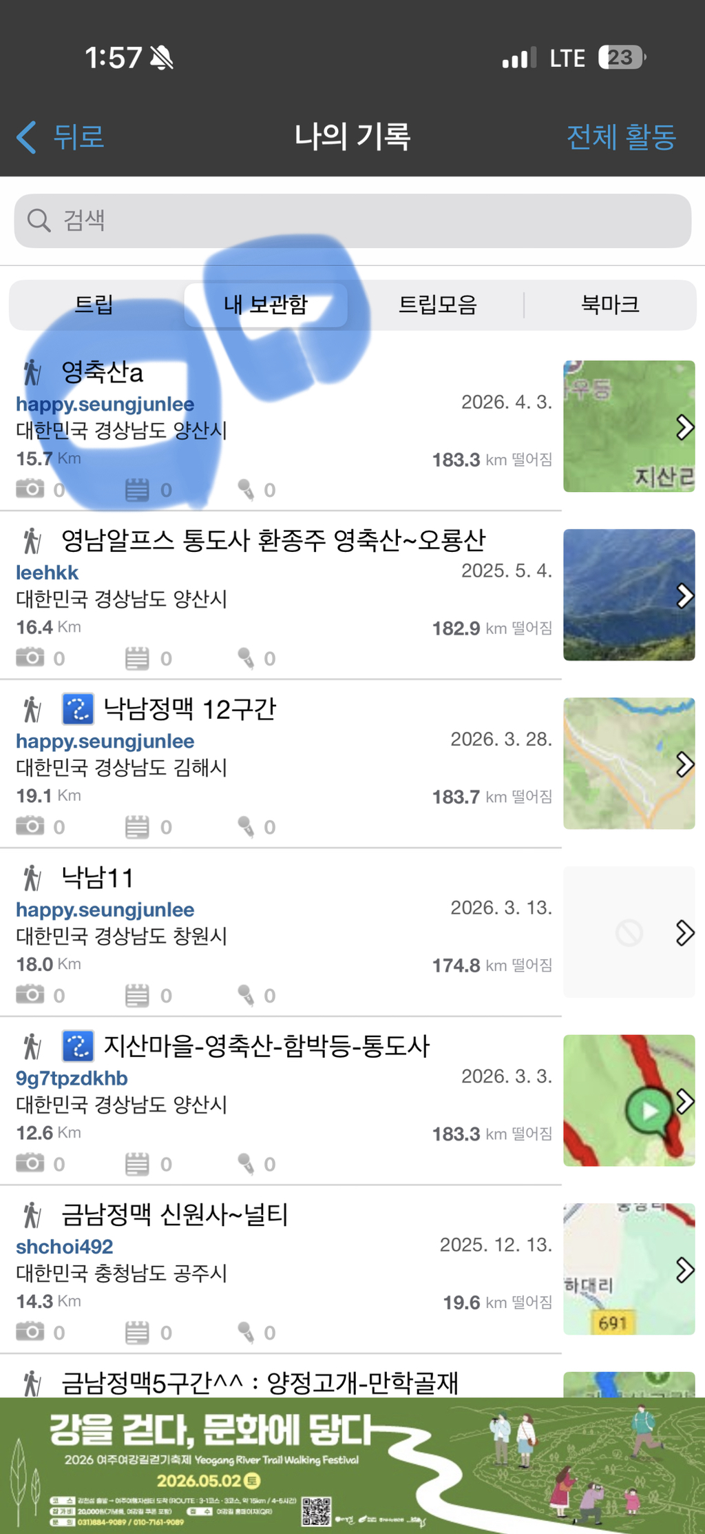 9. 보관하기를 누르면 “내 보관함”으로 해당 gpx가 넘어옵니다.