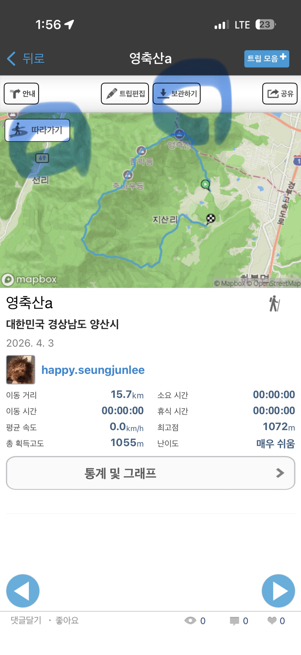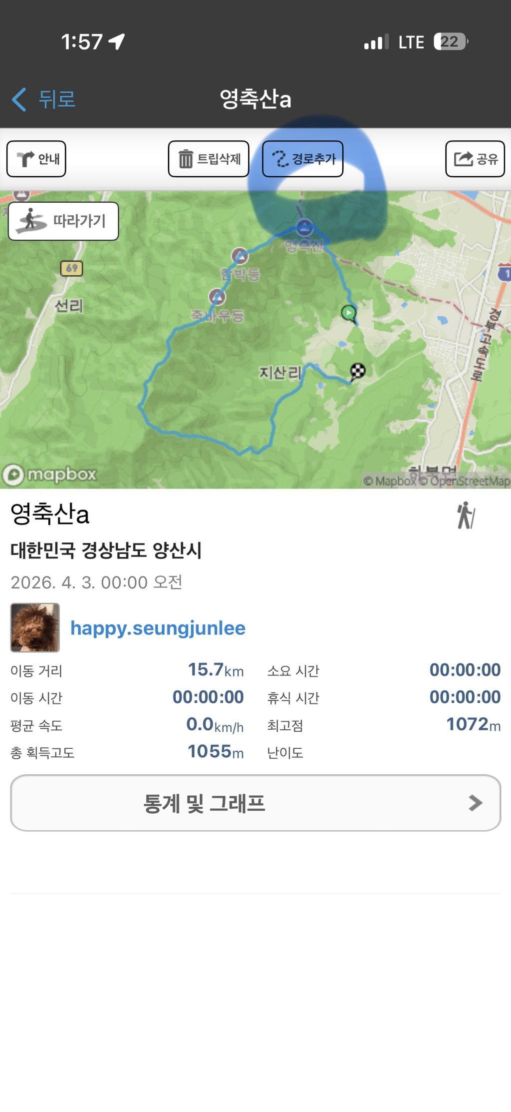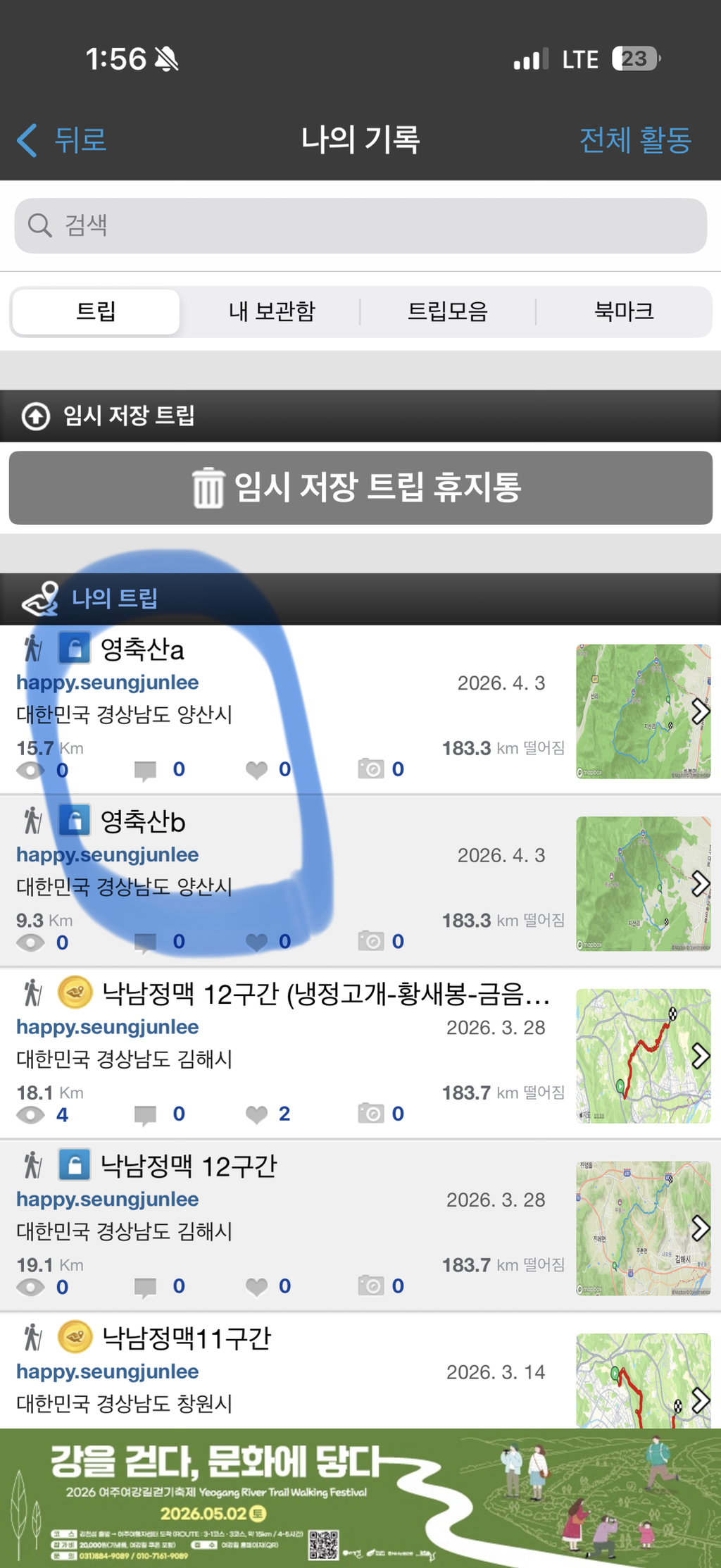 트립을 눌러서 아래와 같이 본인이 업로드한 gpx 파일 정보를 확인. 전 여기서 먼저 영축산a를 눌러봅니다.