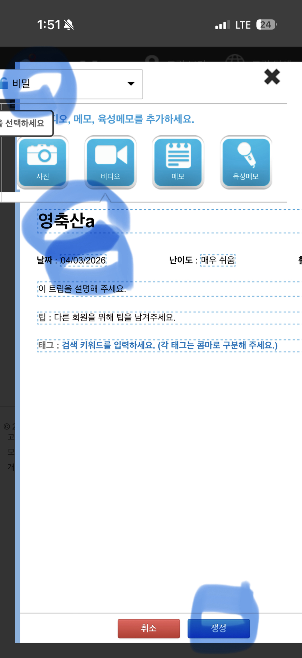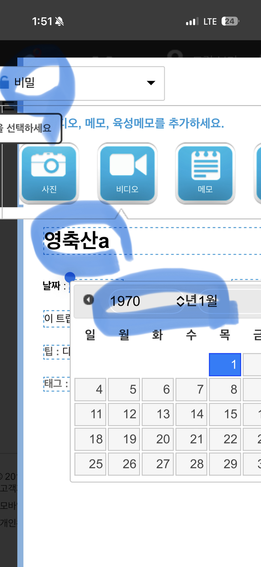 5. 파일업로드 하면 아래와 같이 됩니다. 우선 전체공개할 필요가 없으니 비밀로 설정(추천). 그리고 파일 제목을 작성. 다음 부분이 중요한데, 날짜를 오늘 날짜로 세팅해야 어플에서 찾을 수 있어요. 기본 세팅은 너무 옛날이라 그 날짜까지 뒤져서 찾아야 합니다. (물론 처음 가입해서 본인의 기록이 없으신 분들은 첫 자료로 등록한거니 바로 보이겠네요).