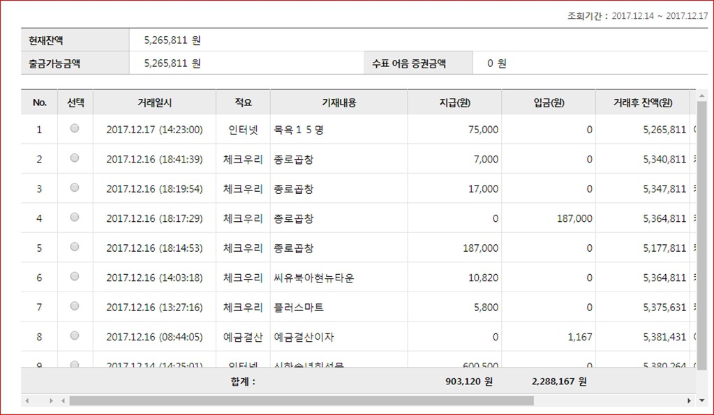 | 2017년 12월 16일 셋째주 (토요일) 결산내역 | |||||