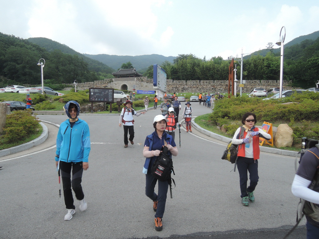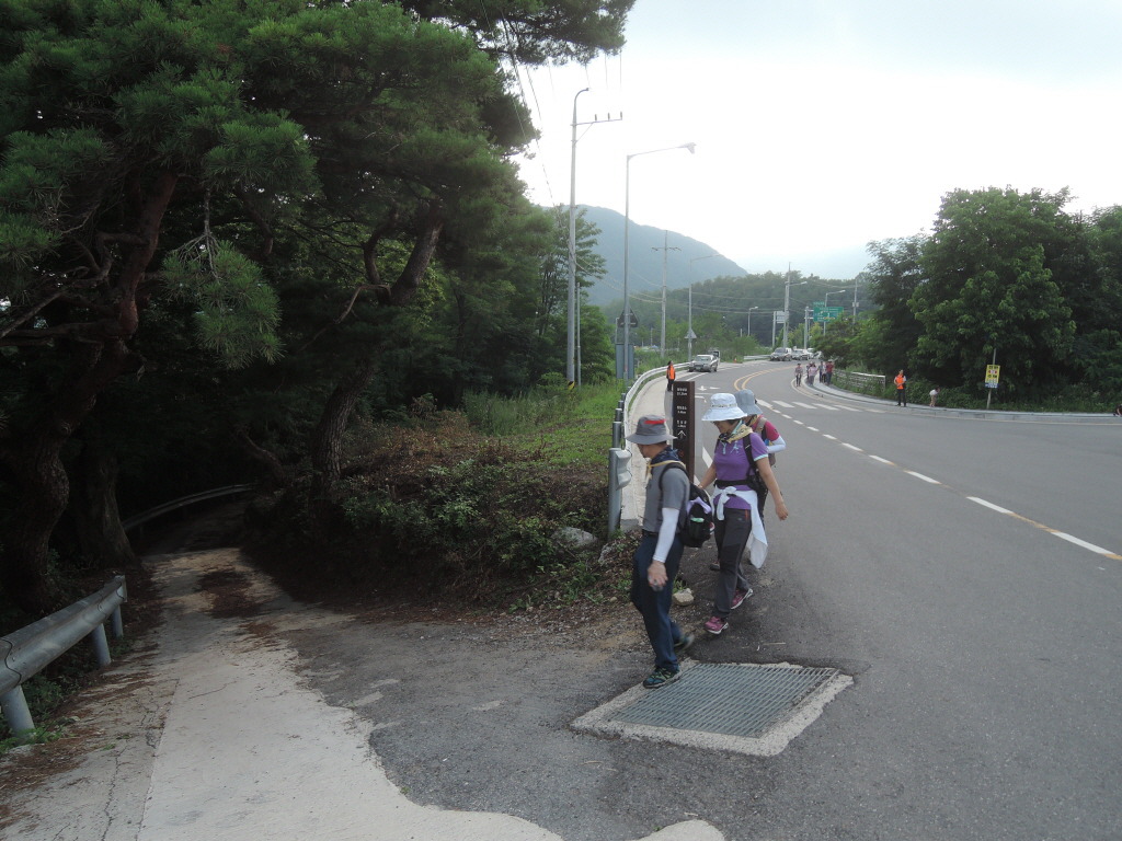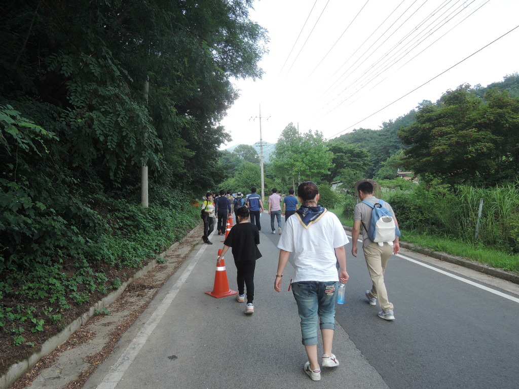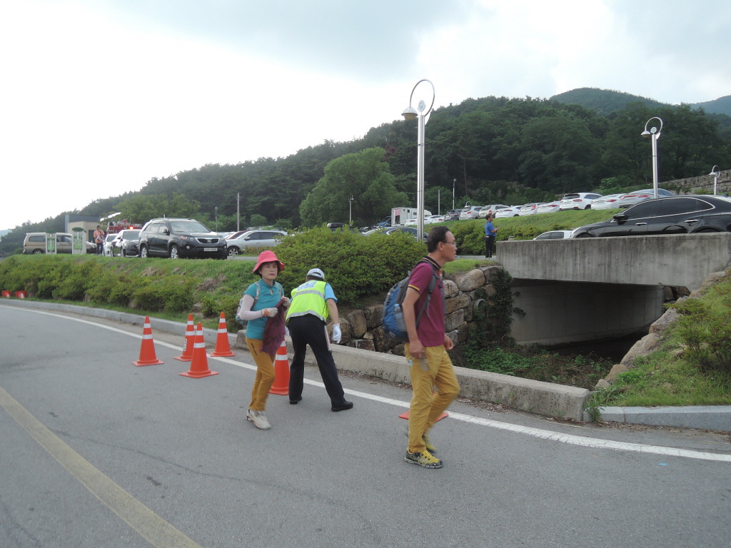 진남문 가산산성 입구와 국도가 만나는 길에 이르고... 이 곳은 안내봉사자가 집중 배치. 대구트레킹 연맹 관계자, 칠곡모범운전자분, 칠곡군 의용소방대분들의 도움으로 안전하게 걷기.