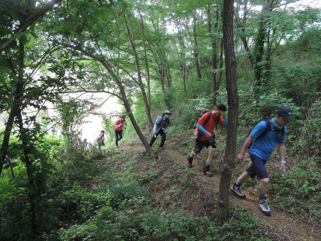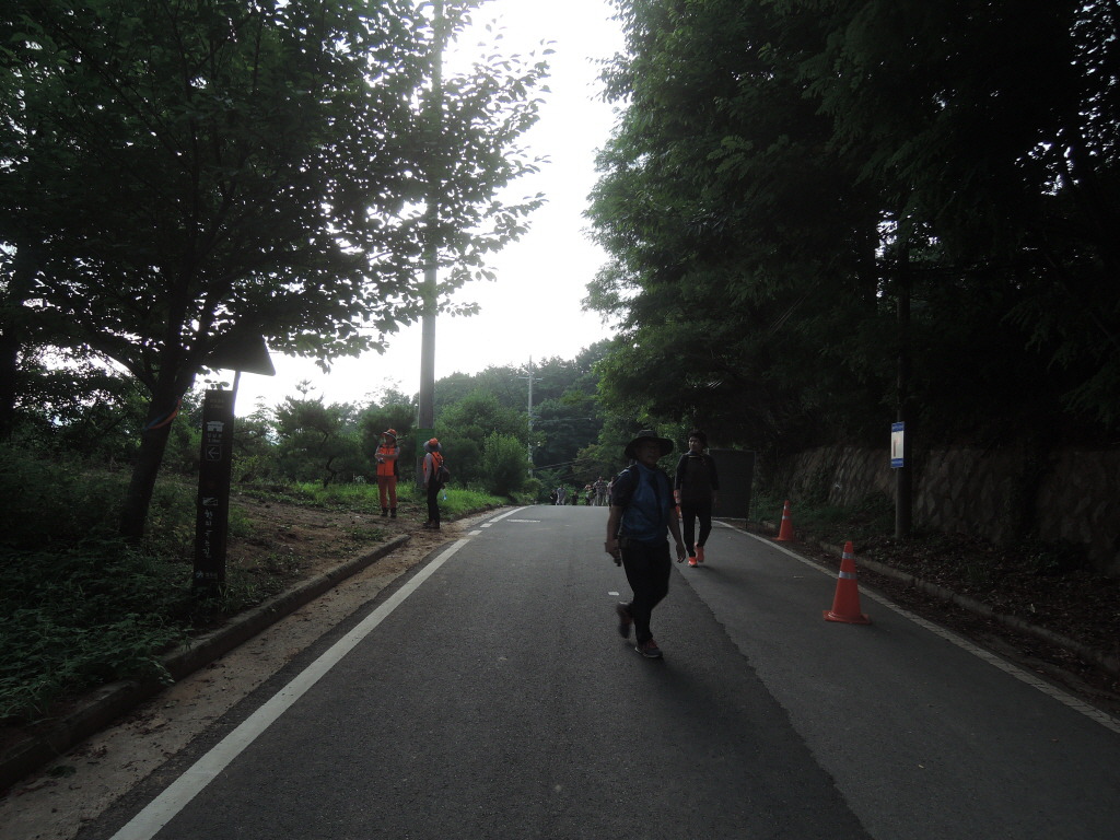 진남문에서 출발해서 오는 휘파람, 울트라 코스 분들도 숲길로부터 내려오는 모습이 보이고. 숲길과 포장도로의 합류지점.