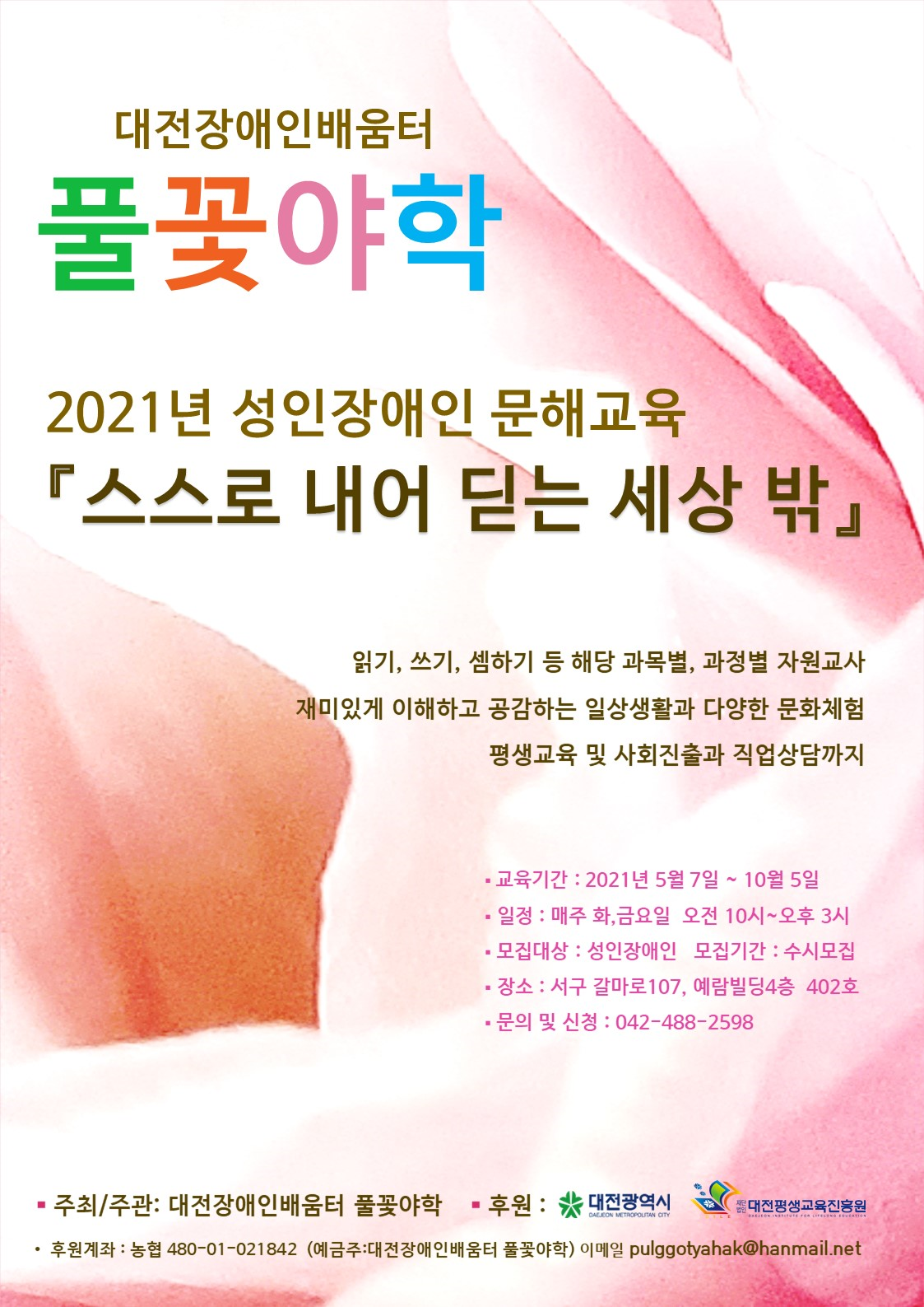 5월부터 시작하는 문해교육 수업입니다. 학생들의 개인별 수준에 맞게 선생님들께서 읽기,쓰기,셈하기 등을 하고 있으면 다양한 문화체험을 하면 평생교육 및 사회진출과 직업상담을 하고 있습니다. 많은 장애인 학생분들이 오셔서 수업을 같이하고 성장할수 있었으면 좋겠습니다.