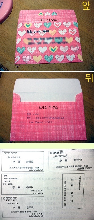 한국에서 한국으로, 혹은 해외로 편지를 보낼때, 편지봉투 앞장에 보내는 이와 받는이의 주소를 함께 쓰는 것이 일반적입니다. 하지만 중국은 좀 다르더라구요, 앞장에는 받는 사람! 뒷장에는 보내는 사람 주소를 씁니다. 또 다른 방법도 있지만 이게 가장 일반적인 방법이에요. 처음에 저도 한국식으로 주소를 썼다가 봉투를 다시 사서 주소를 다시쓰고 불편을 겪었답니다.