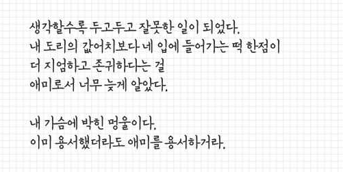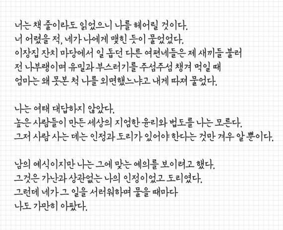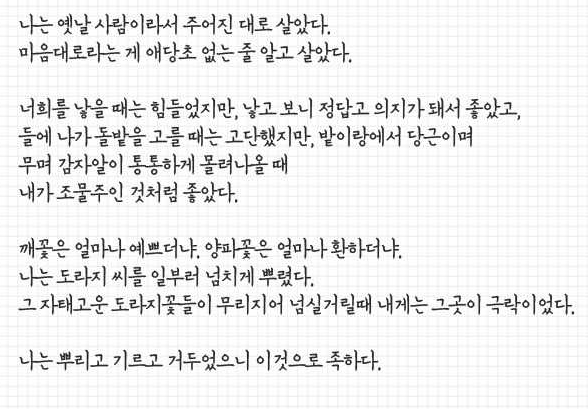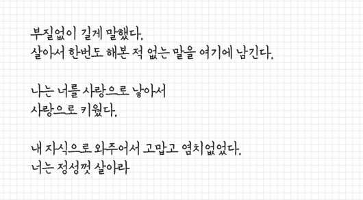 [스크랩] [퍼온 글] 어머니의 마지막 편지 작성자유담|작성시간17.07.27|조회수42 목록 댓글 2 글자크기 작게가 글자크기 크게가 우리나라 어느 시인이 자신의 어머니의 마지막 편지를 다듬어 쓴 글이라 합니다 다음검색 스크랩 원문 : 통전교육연구소 현재 게시글 추가 기능 열기 북마크 공유하기 신고 센터로 신고 댓글 댓글 2 댓글쓰기 답글쓰기 댓글 리스트 작성자조화로운햇살 | 작성시간 17.07.27 우리들 어머니의 모습일까요. 엄마의 목소리를 듣는 듯합니다. 감사드려요. _()_ 답댓글 작성자유담 작성자 본인 여부 작성자 | 작성시간 17.07.28 배우고 안 배우고는 큰 문제가 아닌 것 같아요. 정성과 사랑, 진심으로 살아온 삶에서 배어나오는 저 웅숭 깊은 지혜와 통찰. 저런 노인, 부모, 선배가 되어야 할 텐데요.... 댓글 전체보기