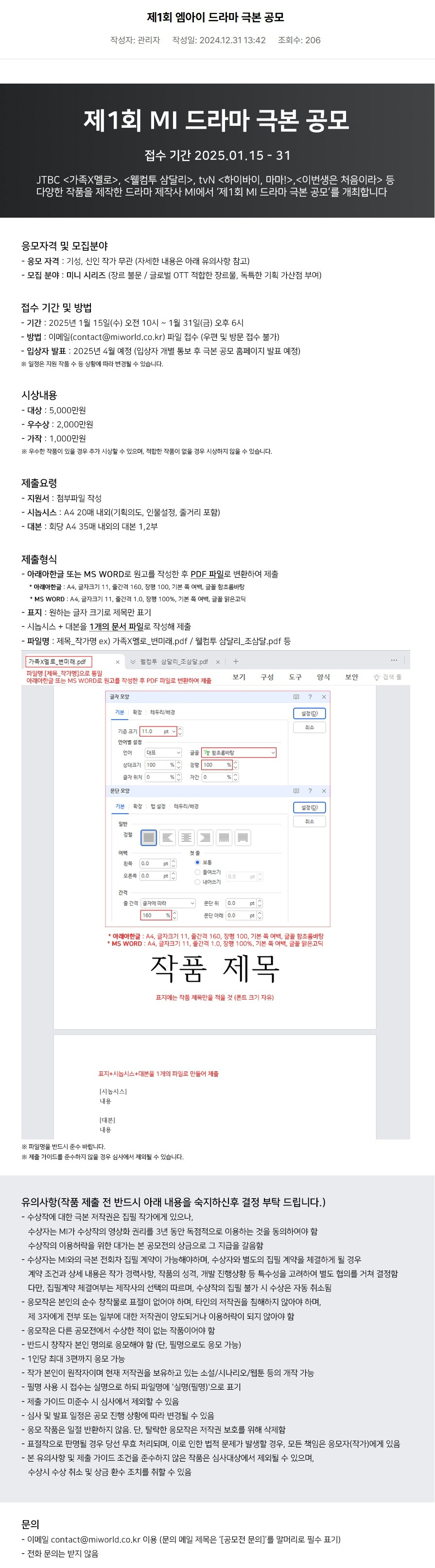 제1회 엠아이 드라마 극본 공모 작성자용글|작성시간25.01.01|조회수321 목록 댓글 0 글자크기 작게가 글자크기 크게가 ‘제1회MI드라마공모’지원서및개인정보수집·이용동의서.docx19.02KB 드라마 제작사 엠아이다양한 기획으로, 감각적 제작으로 스토리의 힘을 선사하는 드라마 제작사 엠아이(MI)의 공식 홈페이지 입니다.www.miworld.co.kr 첨부파일첨부된 파일이 2개 있습니다. jpg 파일 20250101_MI.jpg 다운로드 docx 파일 ‘제1회MI드라마공모’지원서및개인정보수집·이용동의서.docx 다운로드 다음검색 현재 게시글 추가 기능 열기 북마크 공유하기 신고 센터로 신고 댓글 댓글 0 댓글쓰기 답글쓰기 댓글 리스트