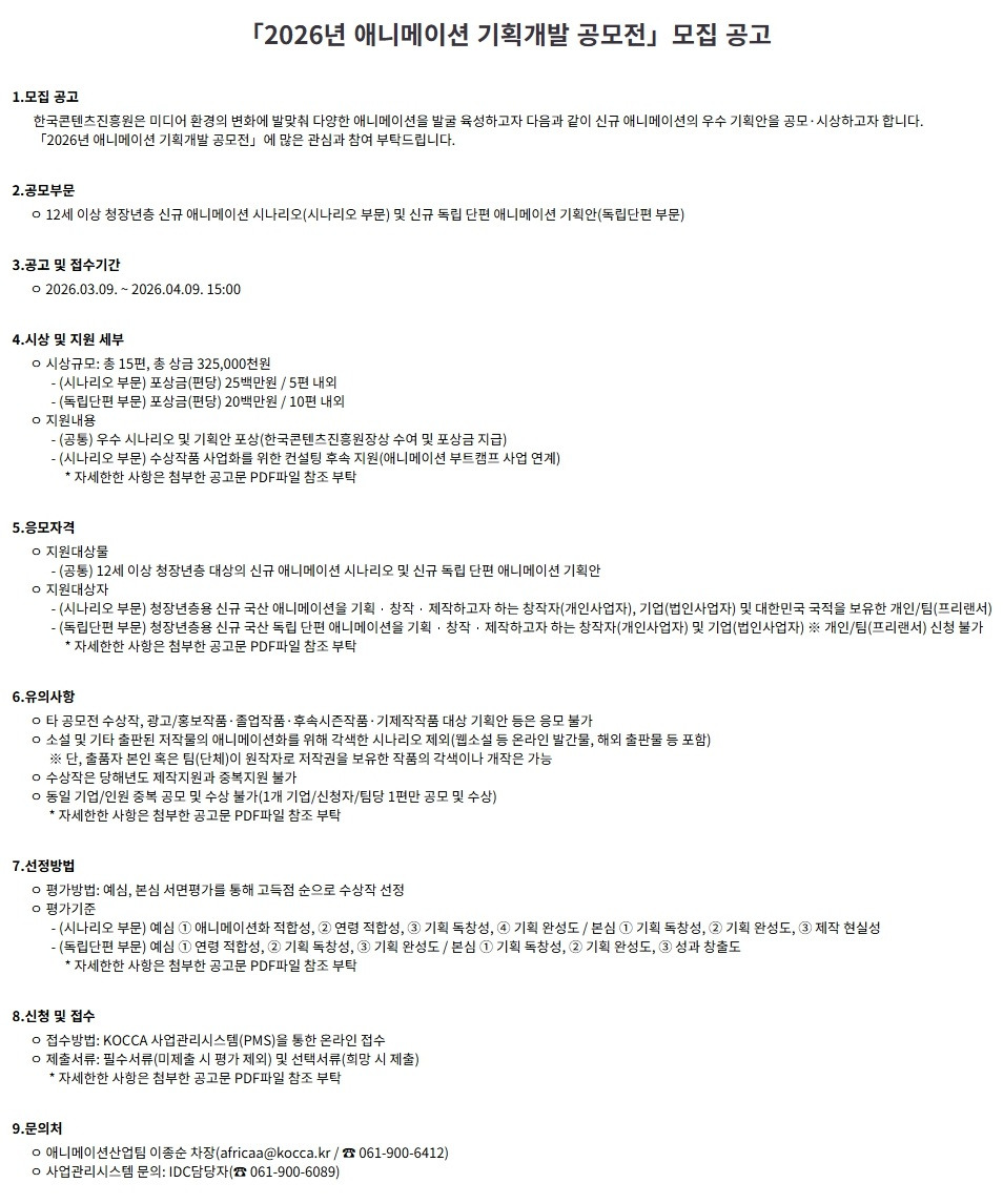 2026년 애니메이션 기획개발 공모전 작성자용글|작성시간26.03.09|조회수78 목록 댓글 0 글자크기 작게가 글자크기 크게가 1.[공고문] 2026년 애니메이션 기획개발공모전_260305.pdf216.19KB2.제출서류 양식.zip205.73KB지원공고 < 알림마당 < 한국콘텐츠진흥원대한민국 콘텐츠 산업 총괄 기관, 방송,게임,음악, 패션, 애니메이션, 캐릭터, 만화, 실감콘텐츠등 장르별 콘텐츠의 제작 지원과 기획·창제작, 유통·해외진출, 기업육성,인재양성, 문화기술개발www.kocca.kr 첨부파일첨부된 파일이 3개 있습니다. jpg 파일 20260309_204016.jpg 다운로드 pdf 파일 1.[공고문] 2026년 애니메이션 기획개발공모전_260305.pdf 다운로드 zip 파일 2.제출서류 양식.zip 다운로드 다음검색 현재 게시글 추가 기능 열기 북마크 공유하기 신고 센터로 신고 댓글 댓글 0 댓글쓰기 답글쓰기 댓글 리스트