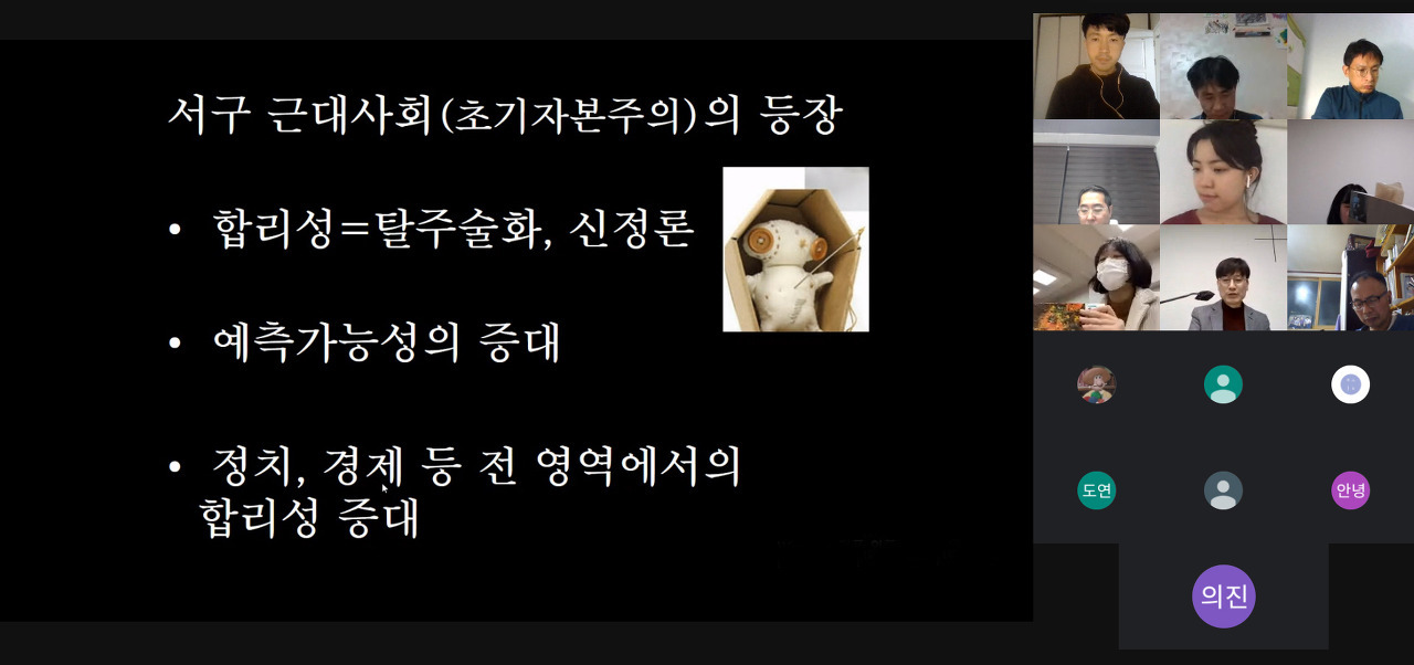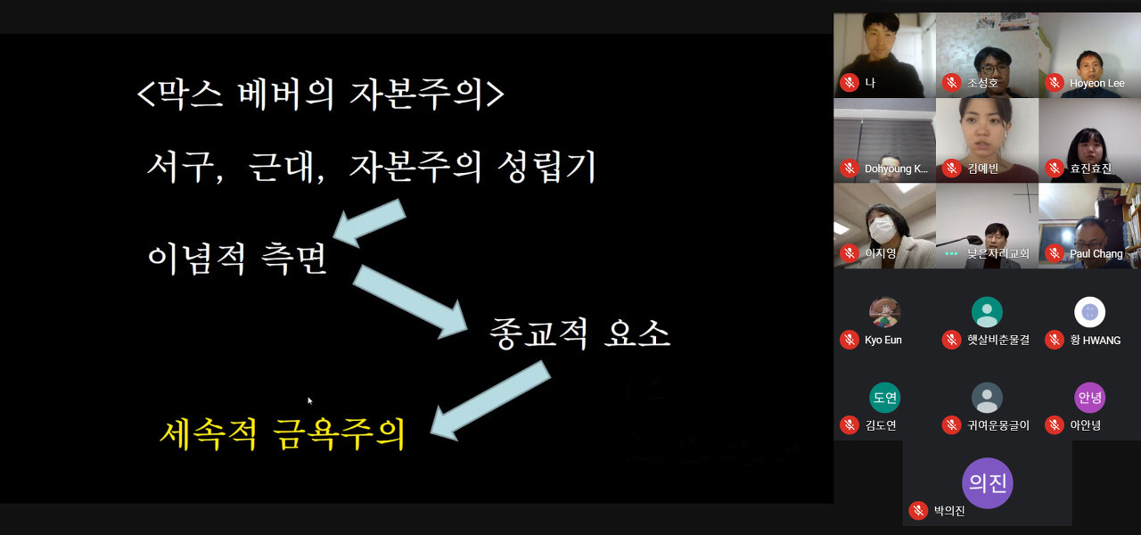 강의 때, 베버의 결론이 담긴 문장을 짚어주셨는데요. 방법의 차이는 있지만, 자본주의 시대에 대한 문제의식은 베버나 맑스나 우열을 가릴 수 있는 것은 아니라는 생각이 들었습니다. 이 공부를 통해 근원에서 자본주의 사회의 문제를 극복할 수 있는 계기가 되었으면 하는 바램이 더 커지는 시간이었습니다.