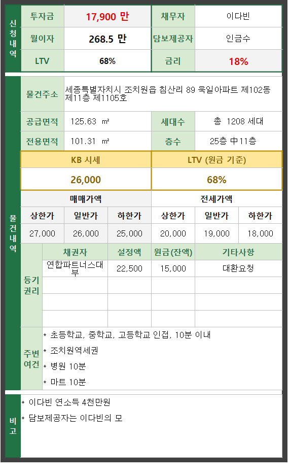 채무자 4대보험가입 직장인 (연봉4,000만원이상) ,세종역세권 GPL투자금 1순위 1억7천9백만원(월이자 2,685,000원, 금리1