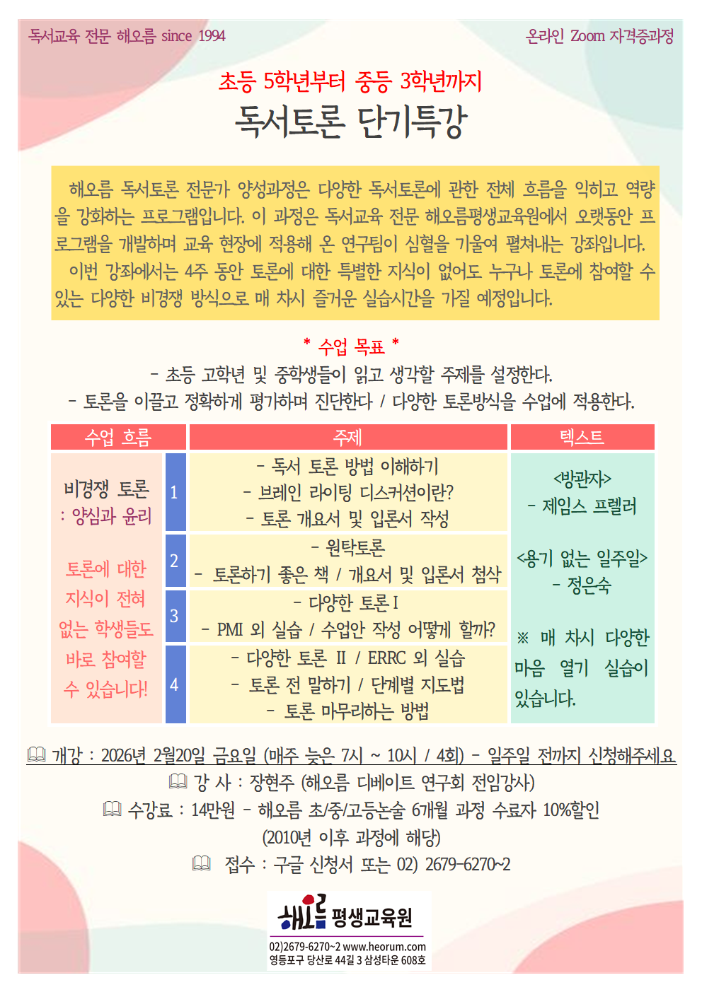 독서교육 전문 해오름평생교육원에서 오는 2월 20일, 초5-중3 독서토론 단기특강 저녁반을 시작합니다^^