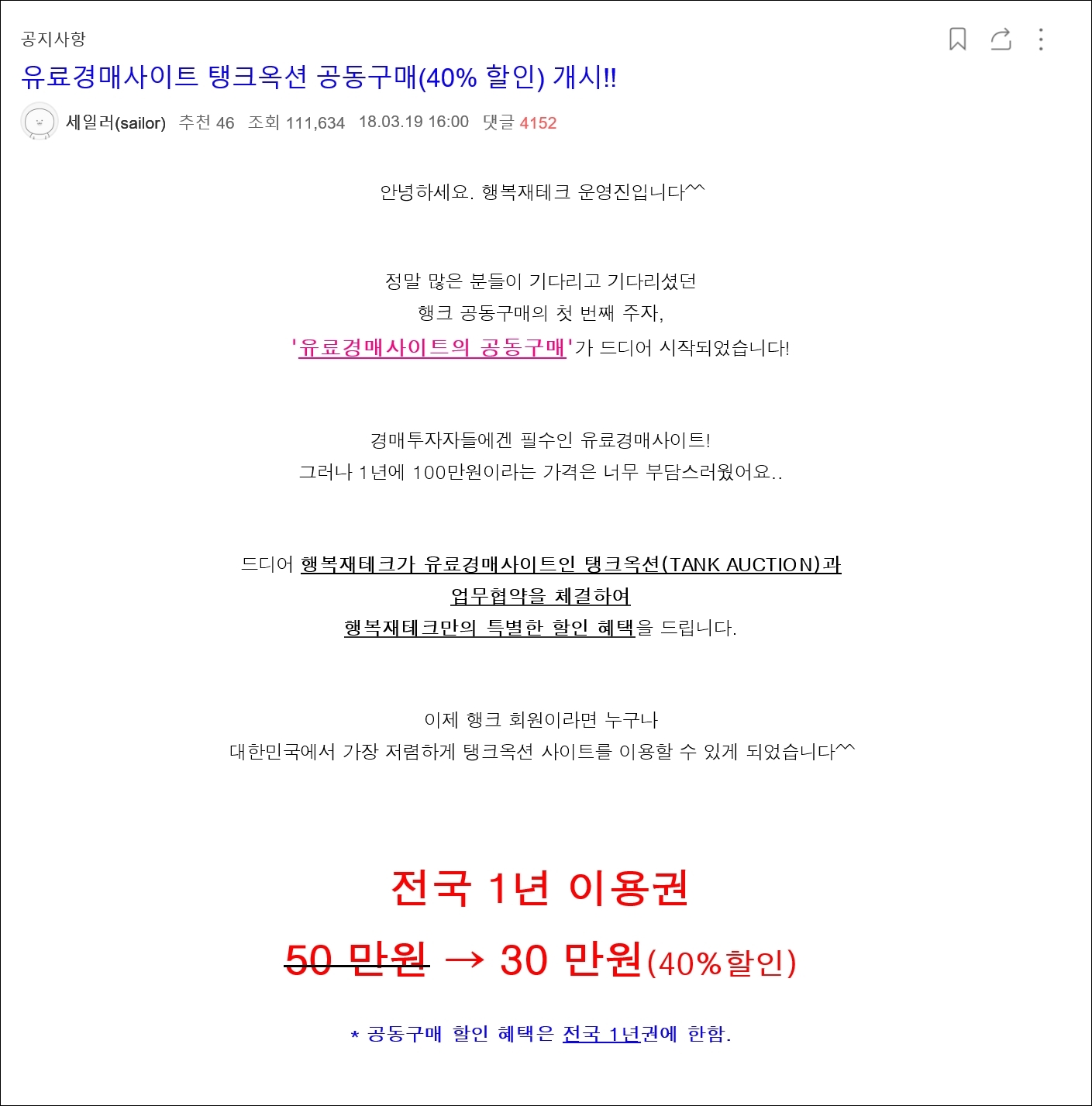 그간 유용하게 사용하시던 탱크옥션 공동구매 혜택이