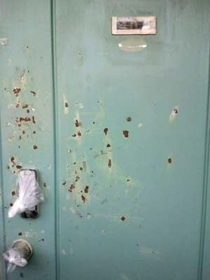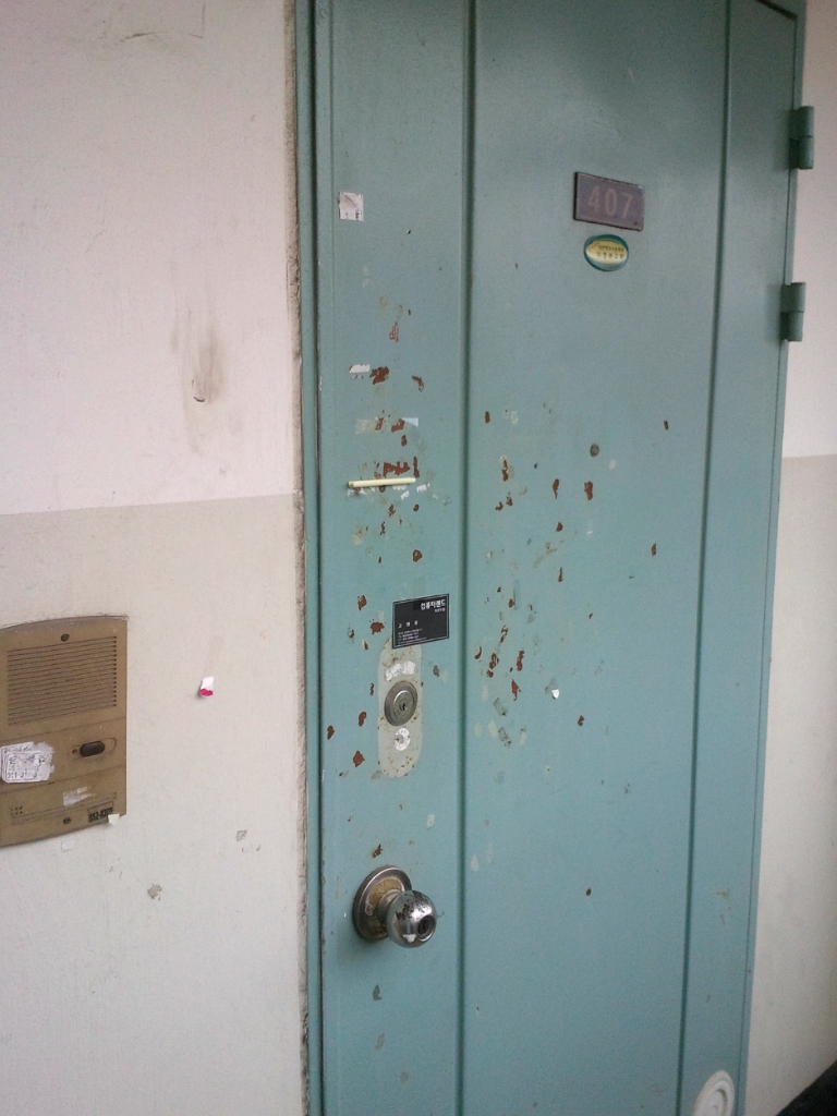 그럼, 오늘의 주인공 얼굴을 좀 볼까요? 저와 현관문의 첫대면은 이랬습니다 T-T 엉망진창;;