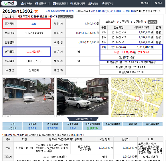 오늘은 그래서, 놓쳤지만 재미있는 물건을 하나 소개할까 합니다. 이 물건은 토지 중에서도 아무도 안쳐다보는 토지… 네 도로 입니다. 설상가상으로 토지 지분 매각이네요? 하지만, 감정가가 1,980,000원 입니다. 그럼 입찰 보증금은 얼마일까요? 한달 밥값이면, 입찰 할 수 있는 좋은 물건이군요 ^^;