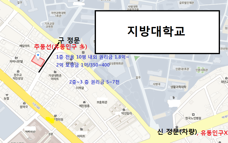 경매물건 위치는 대학교 구정문 앞에 메인 거리상에 있으며, 같은 건물 내 대형커피숍과 햄버거집이 있었고,