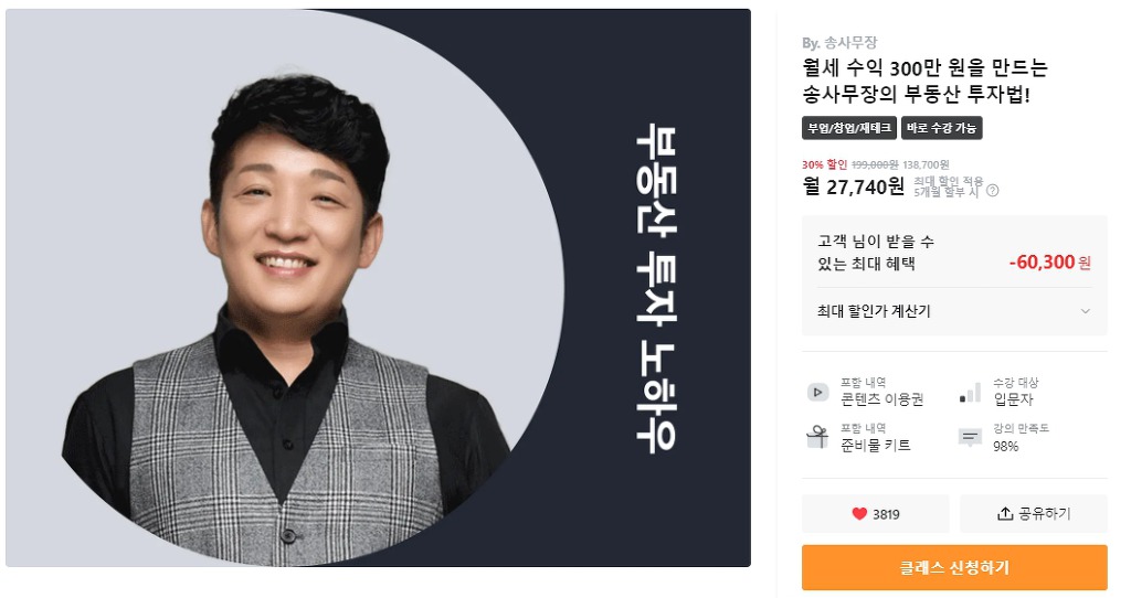 송사무장의 클래스101 무료로 공개된 강의를 링크해 드립니다. 공개된 영상을 먼저 보시면 강의 수강여부를 결정하시는 데 도움이 될 것입니다.
