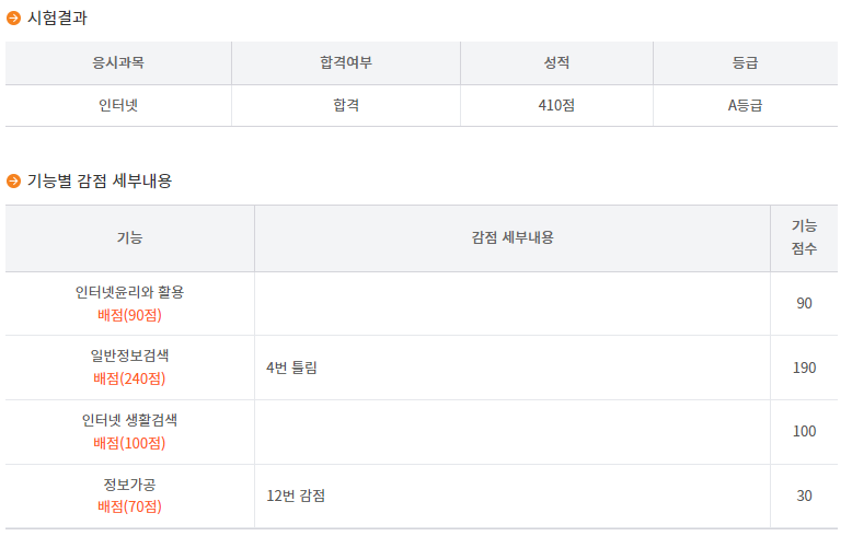 500점 만점 중 410점을 취득하여 ITQ 인터넷은 A등급 취득 하였습니다.