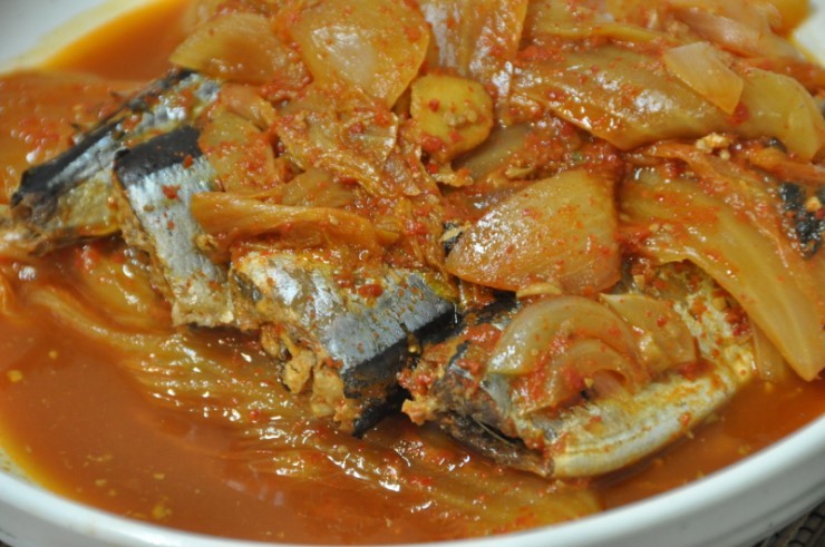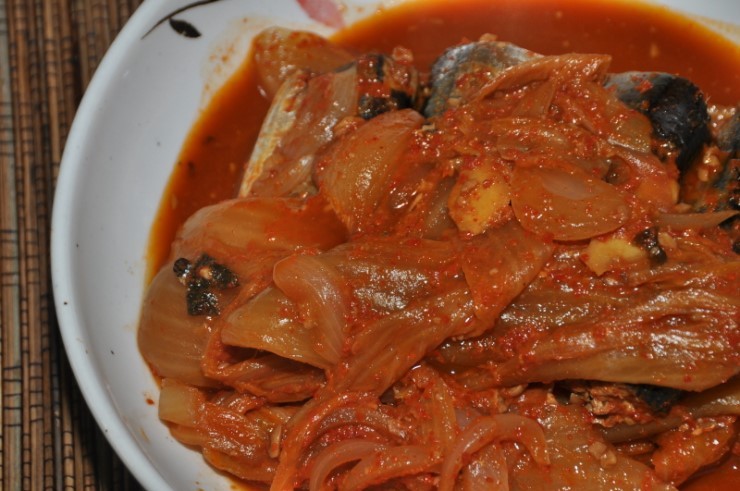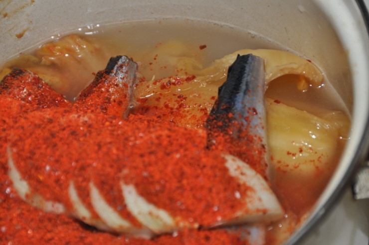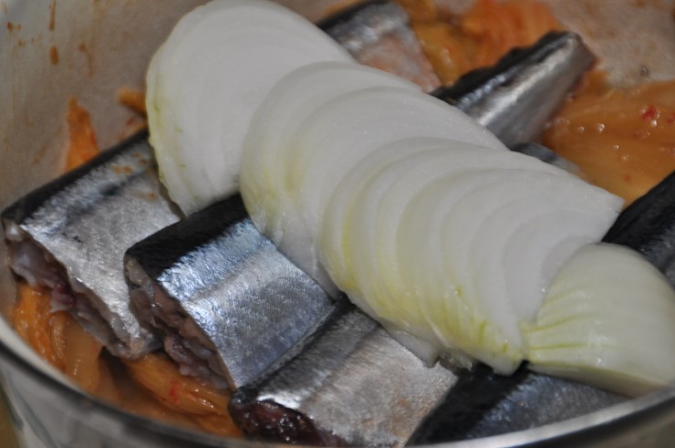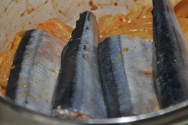 - 바닥에 있는 김치를 위로 올려서 꽁치를 덮어줍니다.