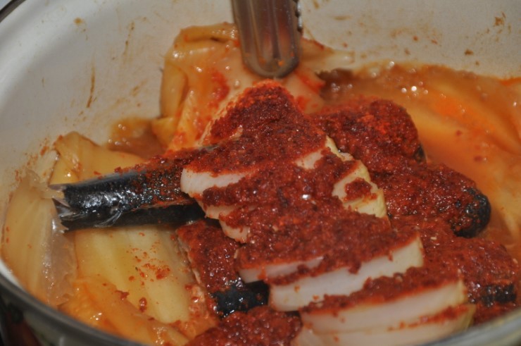 ** 양념들이 꽁치에 배이게 하기 위해 김치와 꽁치위치를 바꿔준다고 생각하시면 됩니다.