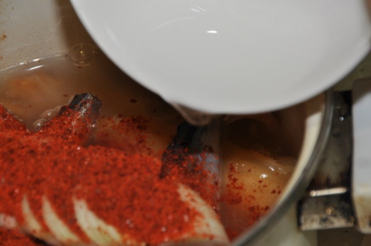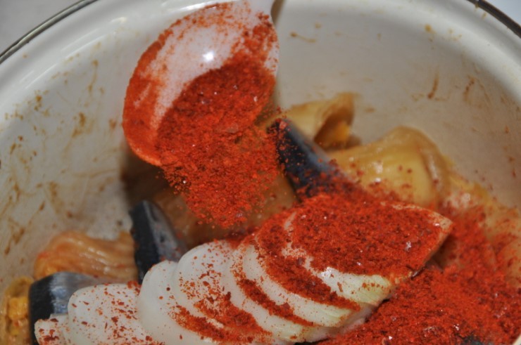 - 고추가루를 꽁치와 양파 위에 한~두큰술 뿌려줍니다.