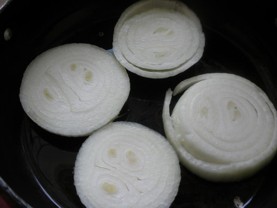 양파1개를 원형모양 으로 1cm 넓이로 잘라서 냄비에 깔았어요.