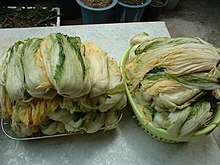 In March 2021, a man claiming to be working for the kimchi industry in China posted a controversial scene of kimchi production in China on Weibo.[69] In the posted photo, cabbages for kimchi are being processed in an open pit. The fork of an excavator is dipped in the pool of cabbages, and a person with no clothes on is sorting the Chinese cabbages. The Chinese authorities explained to the South Korean Ambassador to China that these "picked cabbages" are for the Chinese domestic market and not for exports.[70] In response, South Korean authorities heightened inspections on kimchi imports from China.