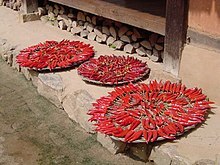 Kimchi has been a staple in Korean culture, but historical versions were not a spicy dish.[25] Early records of kimchi do not mention garlic or chili pepper.[26] Chili peppers, now a standard ingredient in kimchi, had been unknown in Korea until the early seventeenth century due to its being a New World crop.[27] Chili peppers, originally native to the Americas, were introduced to East Asia by Portuguese traders.[26][28][29] The first mention of chili pepper is found in Jibong yuseol, an encyclopedia published in 1614.[19][30] Sallim gyeongje, a 17‒18th century book on farm management, wrote on kimchi with chili peppers.[19][31] However, it was not until the 19th century that the use of chili peppers in kimchi was widespread.[32] The recipes from early 19th century closely resemble today's kimchi.[33][34]