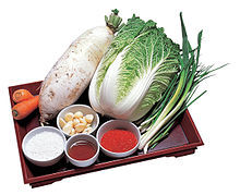 For many families, the pungent and often spicy meal is a source of pride and recalls the taste of a good home.[71] Cabbages (napa cabbages, bomdong, headed cabbages) and radishes (Korean radishes, ponytail radishes, gegeol radishes, yeolmu radishes) are the most commonly used kimchi vegetables.[1][2] Other kimchi vegetables include: aster, balloon flower roots, burdock roots, celery, chamnamul, cilantro, cress, crown daisy greens, cucumber, eggplant, garlic chives, garlic scapes, ginger, Korean angelica-tree shoots, Korean parsley, Korean wild chive, lotus roots, mustard greens, onions, perilla leaves, bamboo shoot, momordica charantia, pumpkins, radish greens, rapeseed leaves, scallions, seaweed, soybean sprouts, spinach, sugar beets, sweet potato vines, and tomatoes.[72]