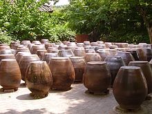 There are hundreds of different types of kimchi made with different vegetables as the main ingredients.[2] Traditionally, winter kimchi, called kimjang, was stored in large earthenware fermentation vessels, called onggi, in the ground to prevent freezing during the winter months and to keep it cool enough to slow down the fermentation process during summer months.[4] The vessels are also kept outdoors in special terraces called jangdokdae. In contemporary times, household kimchi refrigerators are more commonly used.[2]