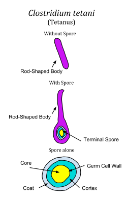 Tetanus is caused by the tetanus bacterium, Clostridium tetani.[1] The disease is an international health problem, as C. tetani endospores are ubiquitous. Endospores can be introduced into the body through a puncture wound (penetrating trauma). Due to C. tetani being an anaerobic bacterium, it and its endospores thrive in environments that lack oxygen, such as a puncture wound. With the changes in oxygen levels, the turkey drumstick-shaped endospore can quickly spread.[26]