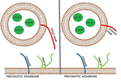 - ^ Jump up to:a b c d e Pellizzari R, Rossetto O, Schiavo G, Montecucco C (February 1999). Clementi F, Fesce R (eds.). "Tetanus and botulinum neurotoxins: mechanism of action and therapeutic uses". Philosophical Transactions of the Royal Society of London. Series B, Biological Sciences. 354 (1381): 259–68. doi:10.1098/rstb.1999.0377. PMC 1692495. PMID 10212474.