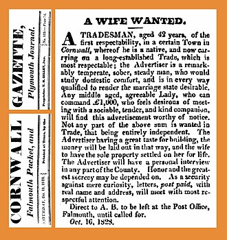 In an 1828 "Wife Wanted" advertisement, an Englishman claiming a "great taste for building" pledges to apply a prospective wife's dowry-like £1000+ to build property that will be "settled on her for life".[58]