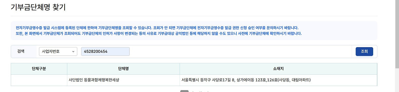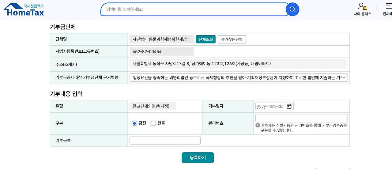 | 1.cms(계좌, 신용카드, 일시기부) 1월15일 국세청 홈텍스를 통해 자동공지됩니다.(별도신청금지) -단, 주민번호가 정확하게 들어가 있거나, 휴대폰으로 받고 싶으신 분은 국세청 홈텍스에 휴대폰 번호를 받드시 등록하고 저희 쪽에도 등록할 수 있도록 연락주십시요. 2. 직접 발급신청을 하셔야 하는경우 구)비영리민간단체 통장 862-910004-59104(하나) 계좌로 자동이체 하는 분들이시거나 현)사단법인 통장 391-910032-67104 현)사단법인 통장 391-910031-75704 입금하신분들은 국세청에서 발급신청을 해주십시요. (정부에서나, 업무상으로 본희는 수기발급을 지양하고 있습니다.) -국세청 기부금영수증 발급신청안내-(2번 만 적용) *국세청 개인로그인 후 왼편탭에서 전자기부금 영수증 클릭 *기부금 단체명 사단법인 동물과함께행복한세상 or 사업자등록번호 452-82-00454 *아래와같이 찾아집니다. *발급하기 직접누르시고 입력하셔도 됩니다. 기부금공제대상, 기부단체 근거법령(일정요건을 충족하는 비영리법인 등으로서 국세청장의 추천을받아 기획재정장관이 지정하여 고시한 법인에 지출하는기부금 법인세법 시행령제39조 제1항제호바목)을 꼭 선택하셔야 합니다. *관리번호는 개인이 임의대로 넣으시면 됩니다. *등록을 눌러주시면 완료처리 됩니다. *문의처 02-313-9333 |