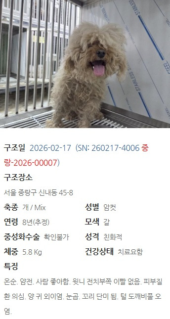 [26서울3] 미라클/믹스/암컷/추정나이18.03.01/5.8kg 작성자동물과함께행복한세상|작성시간26.03.26|조회수69 목록 댓글 2 글자크기 작게가 글자크기 크게가 다음검색 현재 게시글 추가 기능 열기 북마크 공유하기 신고 센터로 신고 댓글 댓글 2 댓글쓰기 댓글 리스트 해당 댓글은 작성자와 운영진만 볼 수 있습니다. 해당 댓글은 작성자와 운영진만 볼 수 있습니다. 댓글 전체보기