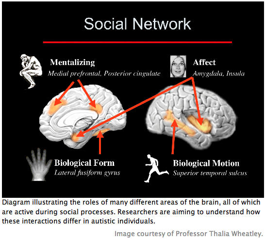 전두엽과의 프로토콜이 안되는 구조 속에 자폐스펙트럼 아이들이 보이는 증세는 다양합니다. 전두엽과의 통신교류가 없다고 해서 모두다 표독하며 난폭하고 공격적인 것은 아닙니다. 자폐증의 공격성이나 표독성은 측두엽의 공포관장 영역인 편도체의 과도한 활성화에서 비롯됩니다. 아래 그림에서 보듯 사회관계망에서 일반인들은 (왼편) 전두엽과 측두엽 등 뇌의 다양한 영역을 비슷한 비중으로 활용하지만 자폐증 사람들은 (오른쪽) 측두엽의 편도체만 지나치게 커져있는 것을 알 수 있습니다.