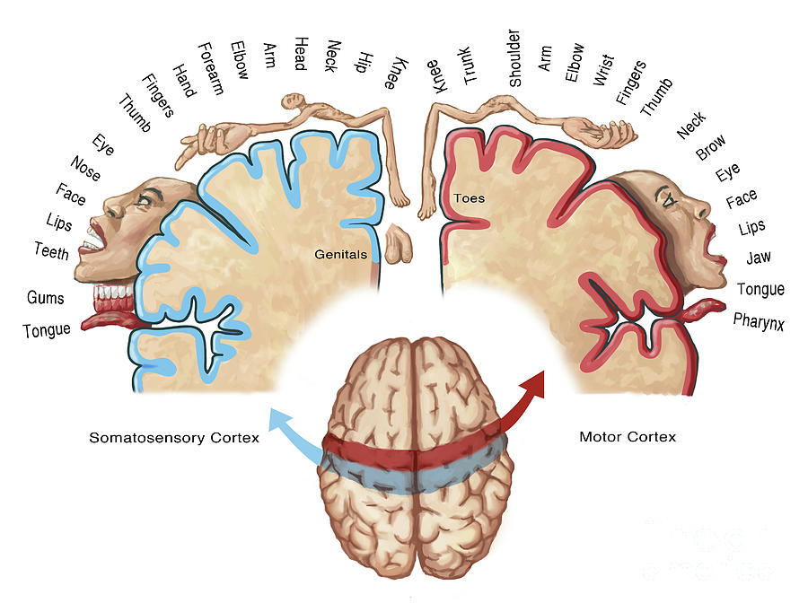 동작피질에서 직접적으로 담당하는 실제 신체부위 영역은 아래 그림과 같습니다. 결국 우리는 신체 하나하나를 움직여서 특정 동작을 만들어낼 때 뇌하고 직접적으로 의사소통을 하고 해당영역으로 전기신호를 보내서 작동을 시켜야 하는 원리입니다. 결론적으로 우리의 동작이란 뇌와 끊임없이 주고받는 소통의 과정입니다.